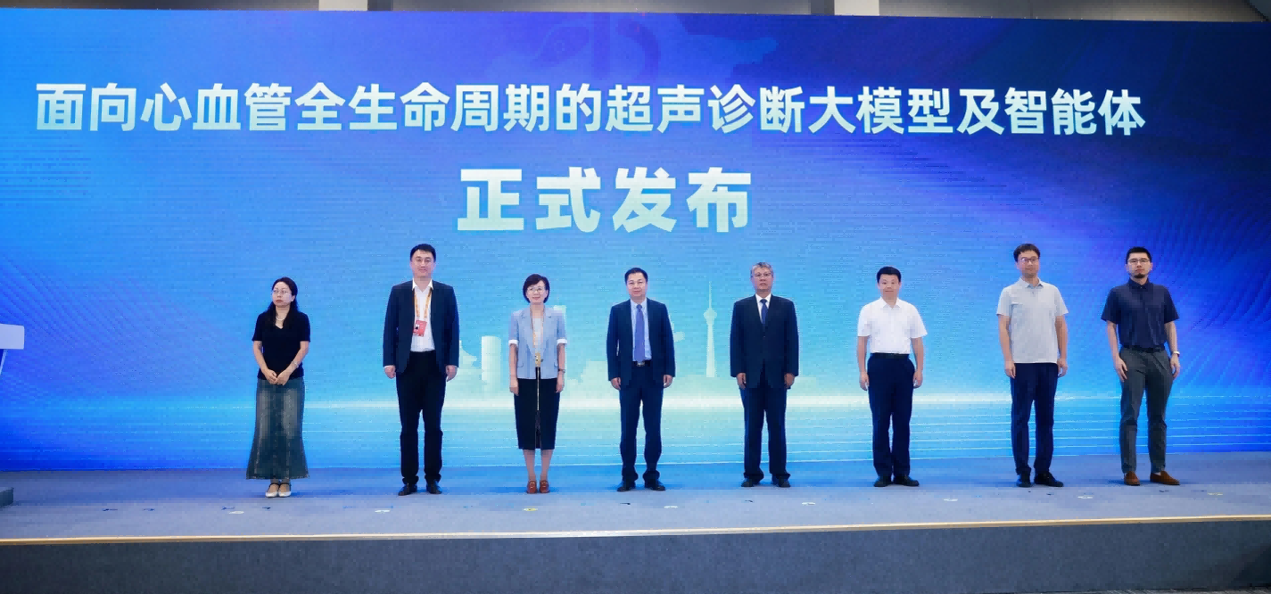 北京市卫生健康委副主任严进、北京医疗健康大模型有限公司总经理宋雨伦、首都医科大学附属北京安贞医院党委书记张宏家、首都医科大学附属北京安贞医院心脏超声医学中心何怡华教授、讯飞医疗研究院院长贺志阳、北京航空航天大学朱皞罡教授、深圳迈瑞生物医疗电子股份有限公司医学影像人工智能总工林穆清、北京先欣安科技有限公司运营总监李欣辉等共同上台见证发布。