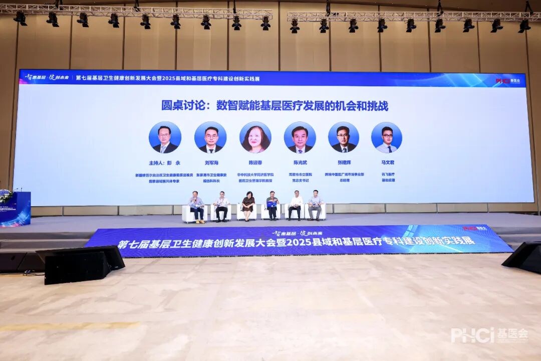 随后的“数智化赋能基层服务能力提升的机会和挑战”圆桌讨论环节,新疆维吾尔自治区卫生健康委原巡视员、国家县域医共体专家彭永主持,张家港市卫健委规信科科长刘军海,高密市市立医院党总支书记陈光武,华中科技大学同济医学院教授陈迎春,讯飞医疗副总经理马文君等企业代表参与交流。主持人与五位嘉宾从卫生行政管理、基层医院实践、高校研究、健康产业发展等视角,分享了他们在不同领域的经验和思考。