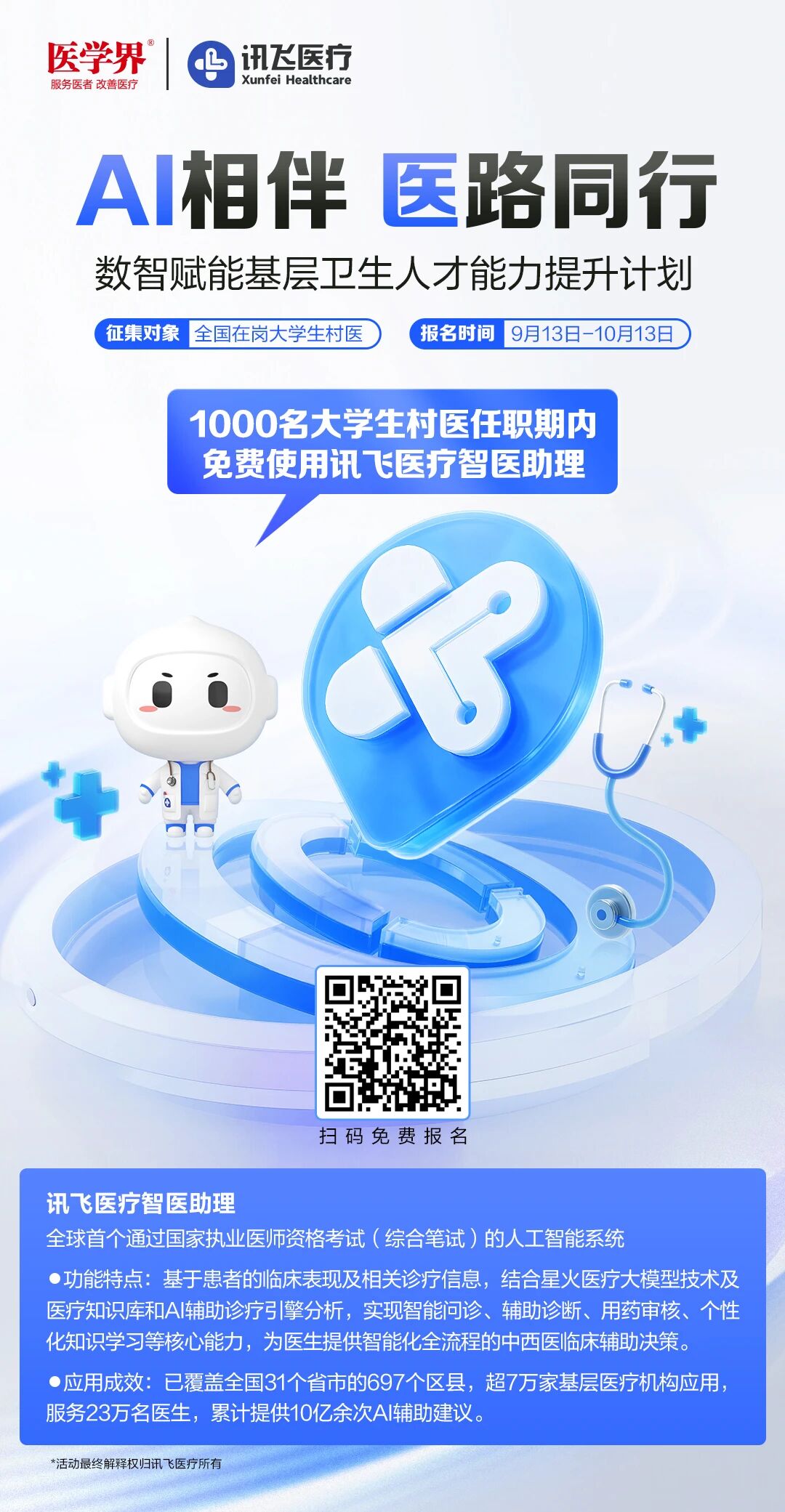 9月12-13日,第七届基层卫生健康创新发展大会暨2025县域和基层医疗专科建设创新实践展在南京盛大开幕。会上,讯飞医疗联合医学界启动“AI相伴 医路同行”数智赋能基层卫生人才能力提升计划,首批计划为1000名大学生村医免费配备智医助理系统,通过技术赋能破解基层医疗人才短缺、服务不均等核心痛点,聚焦健康中国建设实践,筑牢全民健康保障网。